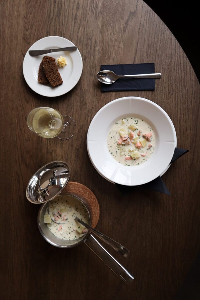Gräddig soppa gjord på inhemsk regnbågslax, serveras med maltbröd och smör.